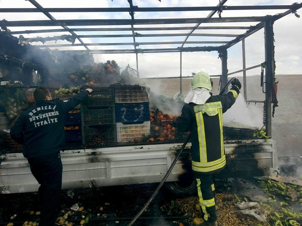 Denizli Büyükşehir Belediyesi itfaiye ekipleri, sebze ve meyve yüklü kasadaki yangını söndürdü.
