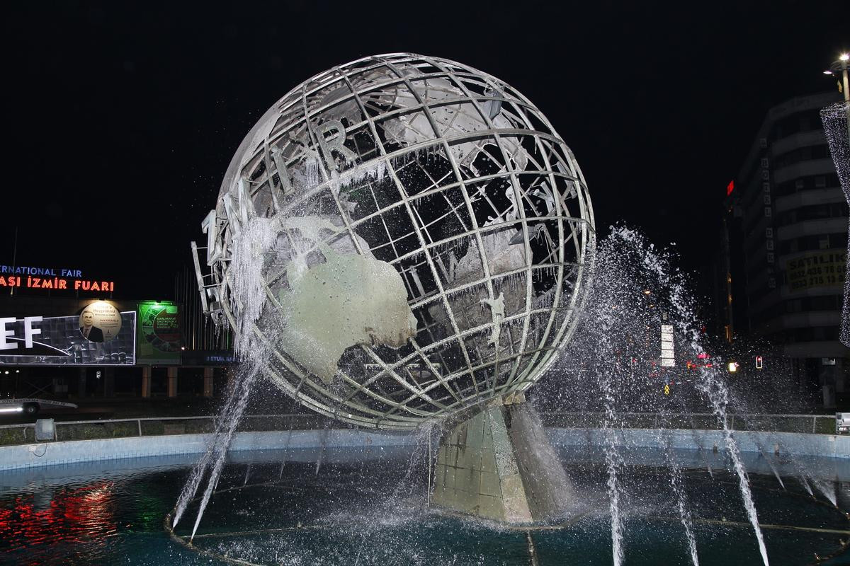 Basmane Meydanı'ndaki Dünya Heykeli buz tuttu, sarkıtlar oluştu. Kent merkezindeki süs havuzları da dondu.