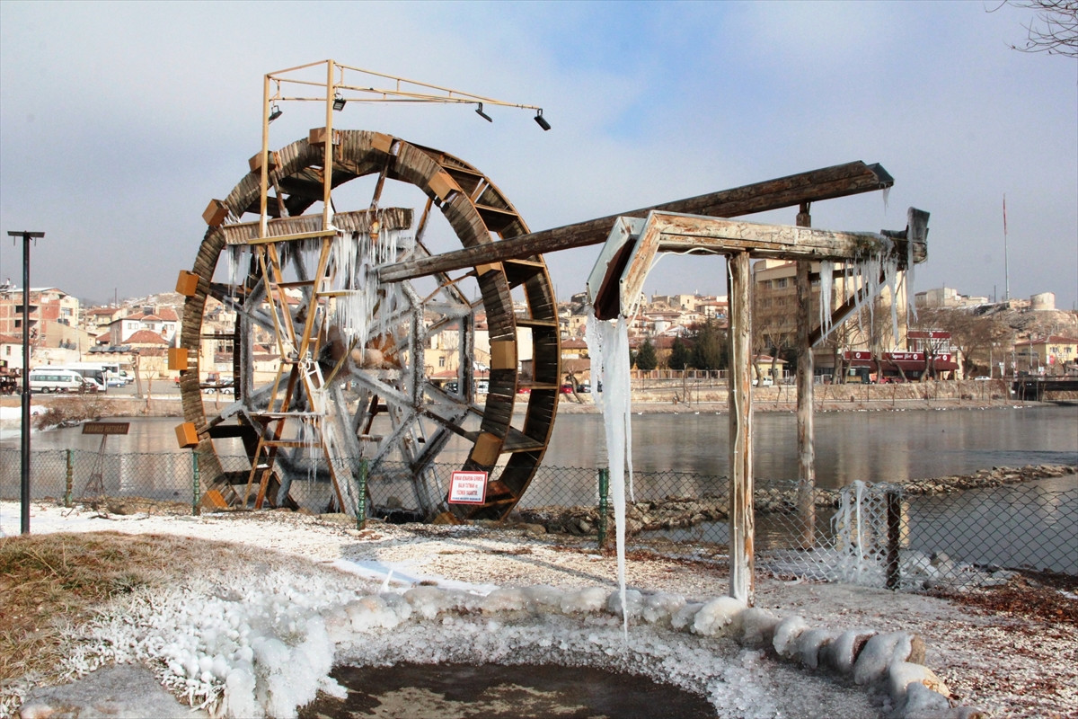 Hava sıcaklığı gece ve gündüz sıfırın altında seyreden Avanos ilçesinde Kızılırmak kenarında bulunan, ahşaptan yapılan su değirmeni dondu.