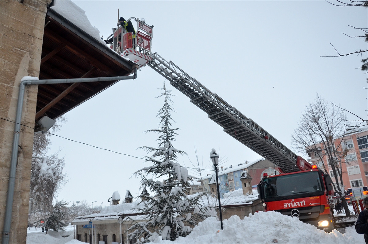 KARAMAN (AA) - Kar yağışının etkili olduğu Karaman'da itfaiye ekipleri, biriken karlar nedeniyle çökme tehlikesi bulunan Aktekke Camisi'nin çatısını temizledi.
