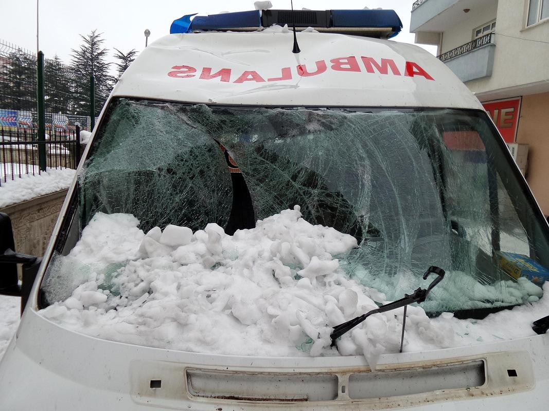 Kent merkezinde ise bir okulun çatısından kayan kar kütlesi, özel hastaneye ait ambulansın üzerine düştü. Park halindeki ambulansta hasar oluştu.