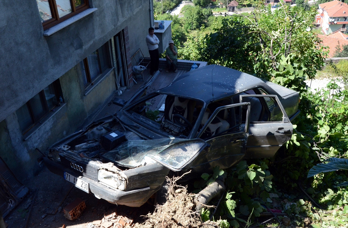 Necati Tüfekçi'nin kullandığı 71 AY 230 plakalı otomobil, Şehit Asker Nuh Bak Caddesi'ndeki rampada frenin sonucu yaklaşık 10 metre yükseklikten bir evin bahçesine düştü.