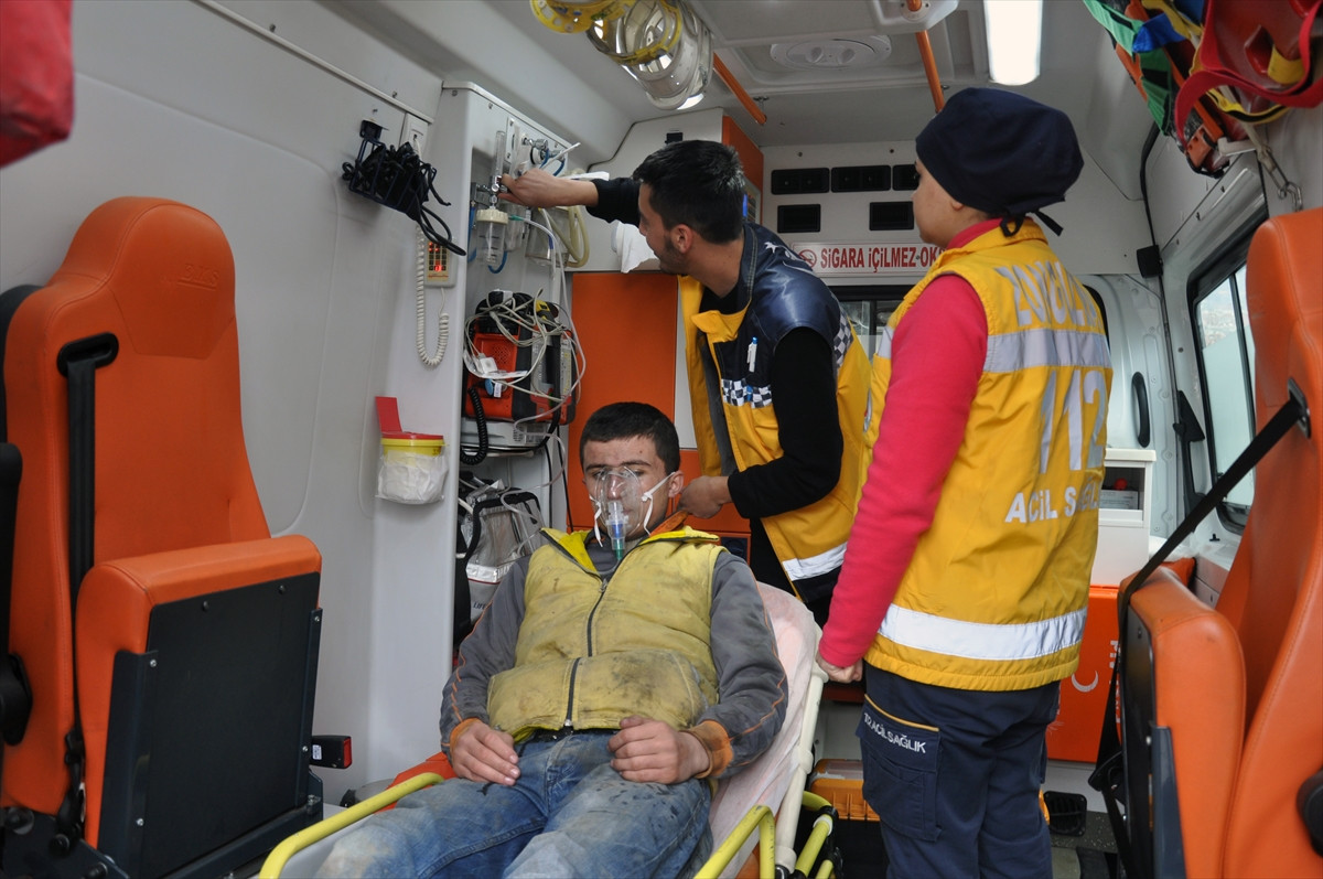Sağlık ekipleri, dumandan etkilenen bir işçiye ambulansta müdahale etti.