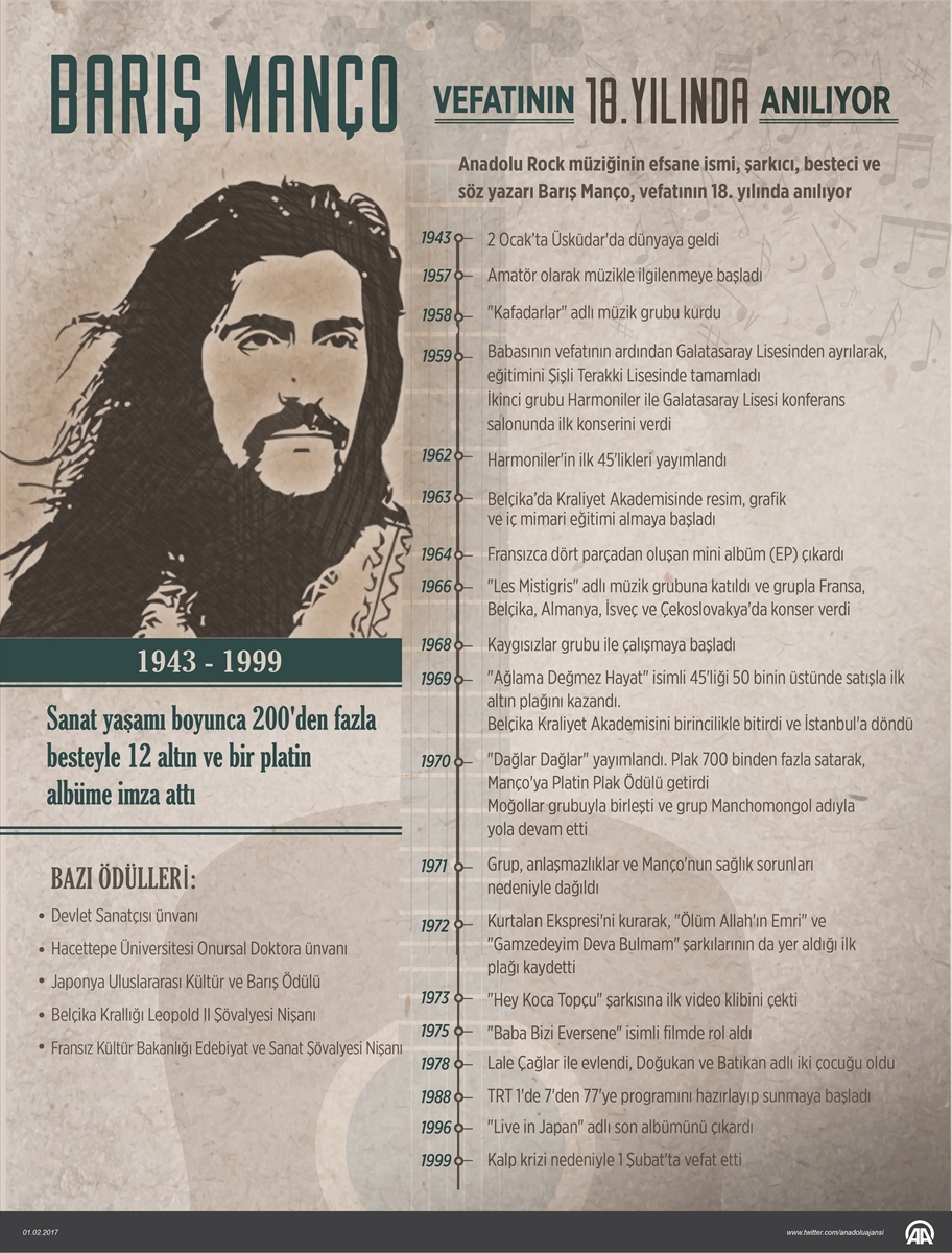 Türk müziğinin usta ismi Barış Manço vefatının 18. yılında düzenlenen programlarla anılacak... 31 Ocak 1999'da Moda'daki evinde kalp krizi geçiren ve ardından kaldırıldığı hastanede 1 Şubat'ta hayatını kaybeden efsane sanatçı Barış Manço, sevenleri tarafından unutulmadı.