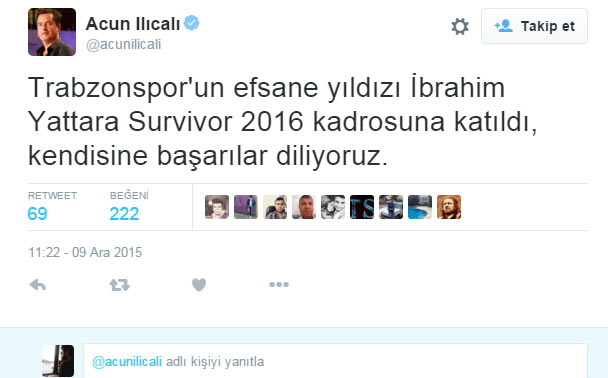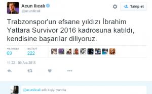 Ünlü televizyoncu ve fanatik Fenerbahçeli Acun Ilıcalı, Trabzonspor'un efsane ismi Gineli İbrahim Yattara'nın Survivor 2016 kadrosunda olacağını duyurdu.