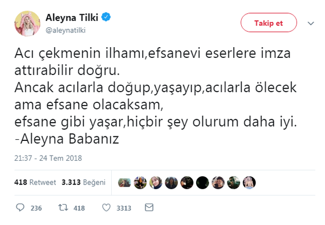 Genç şarkıcı Aleyna Tilki, Twitter hesabından ''Acı çekmenin ilhamı, efsanevi eserlere imza attırabilir doğru. Ancak acılarla doğup, yaşayıp, acılarla ölecek ama efsane olacaksam, efsane gibi yaşar, hiçbir şey olurum daha iyi." 'Aleyna Babanız' paylaşımını yaptı.