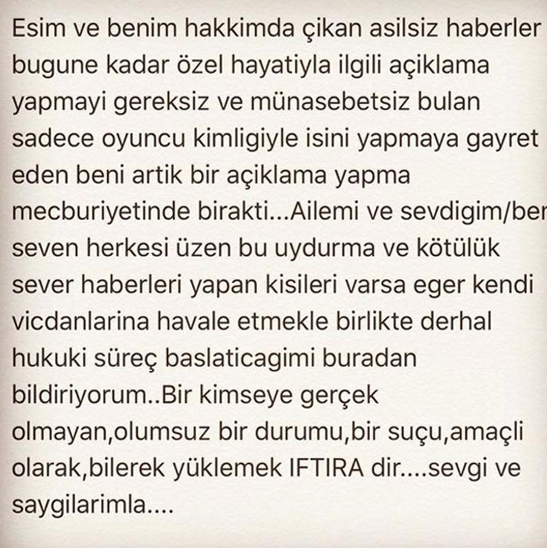 Eşim ve benim hakkımda çıkan asılsız haberler, bugüne kadar özel hayatıyla ilgili açıklama yapmayı gereksiz ve münasebetsiz bulan sadace oyuncu kimliğiyle işini yapmaya gayret eden ben artık bir açıklama yapama mecburiyetinde bıraktı.