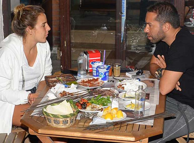 Asmalımescit’teki bir restoranda görüntülenen ünlü çift beraber yemek yedi. Flaşlar patlayınca paniğe kapılan Alkoçlar “Eyvah! Nereden buldular ki” diye söylenirken, Garipoğlu rahat tavırlarıyla dikkat çekti.
