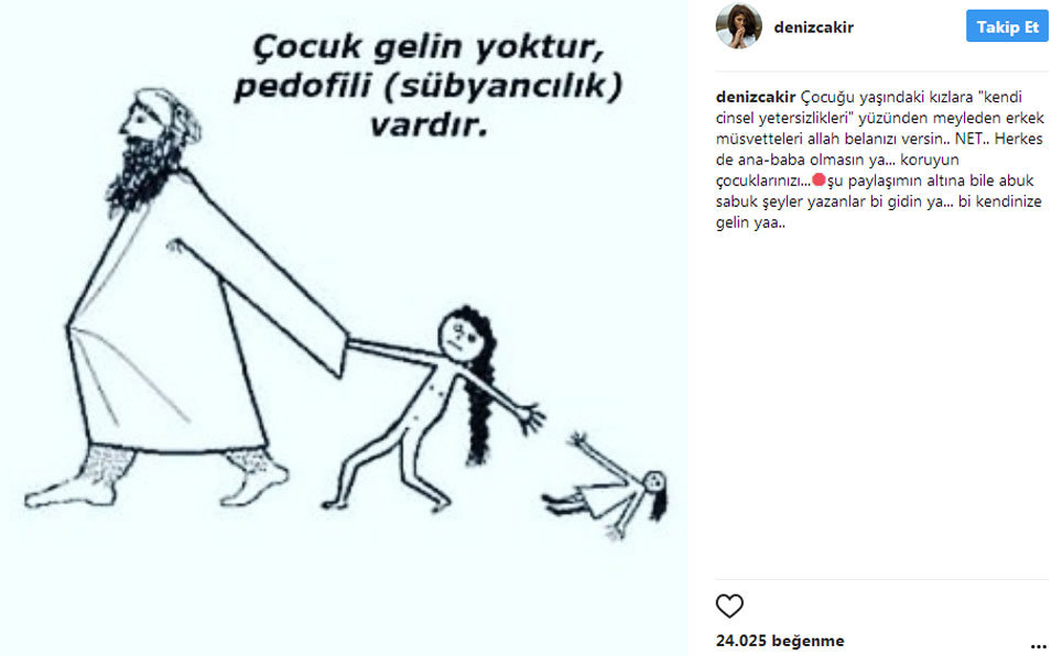 ''Çocuğu yaşındaki kızlara 'kendi cinsel yetersizlikleri' yüzünden meyleden erkek müsveddeleri Allah belanızı versin! NET… Herkes de ana-baba olmasın ya… Koruyun çocuklarınızı… Şu paylaşımın altına bile abuk sabuk şeyler yazanlar bir gidin ya… Bir kendinize gelin yaa…''
