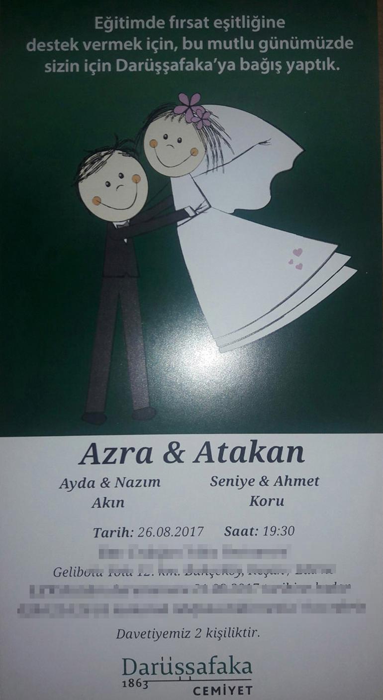 Çiftin düğün hazırlıkları sürerken düğün davetiyeleri Darüşşafaka Cemiyeti'ne yaptıkları bağış üzerine hazırlandı. Davetiyelere ’Eğitimde fırsat eşitliğine destek vermek için, bu mutlu günümüzde sizin için Darüşşafaka’ya bağış yaptık" notu eklendi.
