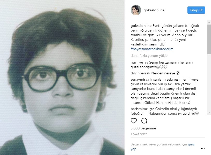 Lise yıllarıyla şimdiki hali arasında dağlar kadar fark olan Göksel, fotoğraf paylaşıp altına şu notu düşmüştü: "Evett günün şahane fotoğrafı benim. Ergenlik dönemim pek sert geçti, tombul ve gözlüklüydüm. Ahhh o yıllar! Kasetler, şarkılar, şiirler, henüz yeni keşfettiğim sesim . #hayatsanatesekkurederim''