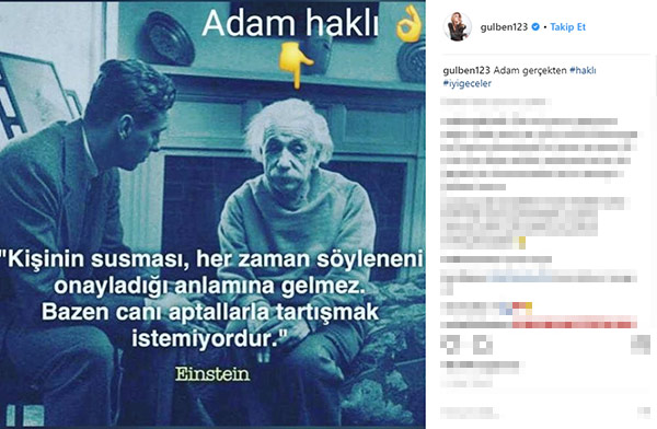 Ünlü şarkıcı, Einstein'ın, "Kişinin susması, her zaman söyleneni onayladığı anlamına gelmez. Bazen canı aptallarla tartışmak istemiyordur." sözünü, "Adam gerçekten haklı" notuyla paylaştı.