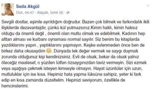 “Bazen çok bilmek ve farkındalık ikili ilişkilerde dezavantajdır, çünkü kül yutmazsınız. Kimin haklı, kimin haksız olduğu da önemli değil , önemli olan mutlu olmak ve edebilmek. Kadının hep alttan alması ve kurbanı oynaması normal sayılır. Siz benim bu kitaplarda yazdıklarımı yapın, yaptıklarımı yapmayın. Keşke evlenmeden önce ben de birkez daha okusaydım.