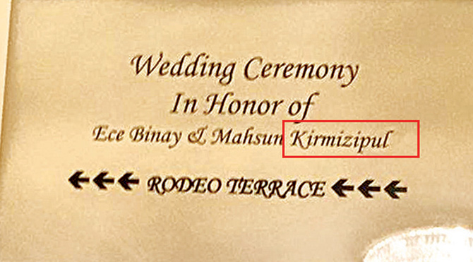 Düğünün en ilginç detayı ise ünlü sanatçının soyadının yanlış yazılması oldu. Kırmızıgül’ün soyadı Amerikan görevli tarafından yanlış algılanınca nikâhının kıyıldığı tören alanının girişine “Ece Binay & Mahsun Kirmizipul” yazılı bir yol oku konuldu.