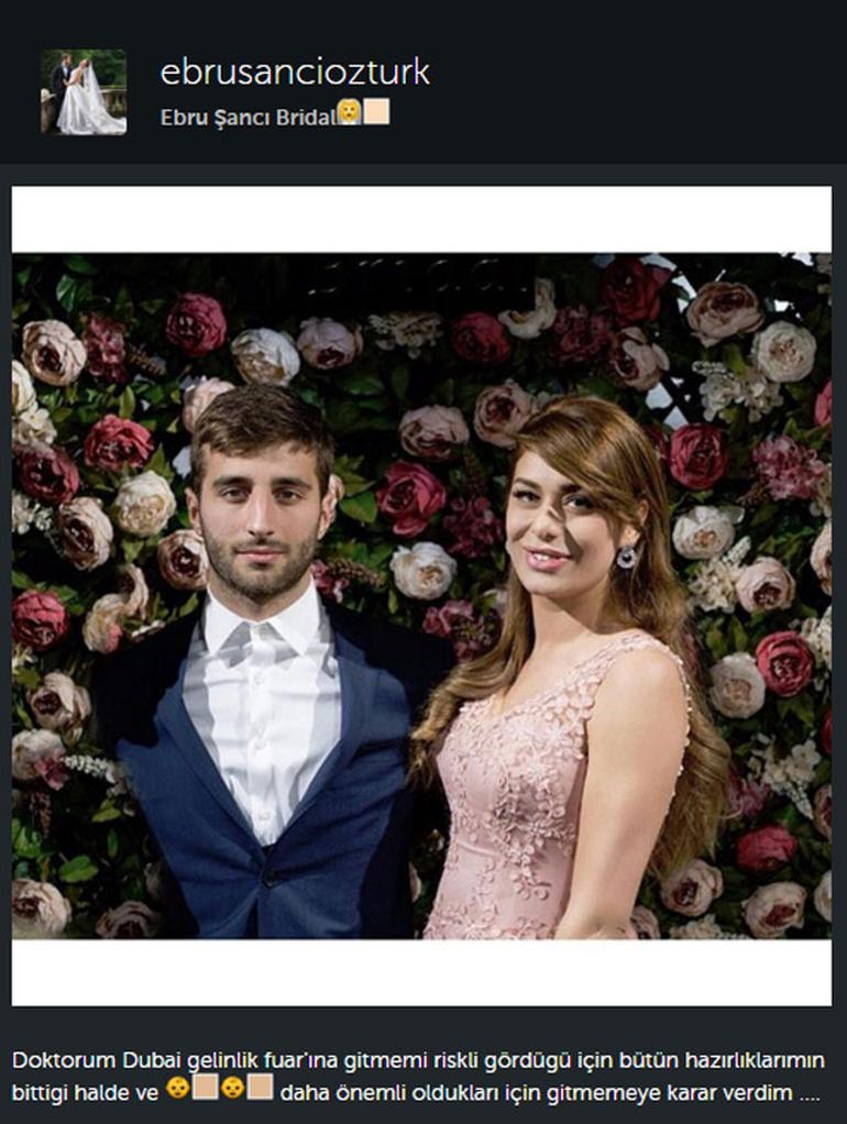 Instagram sayfasında eşiyle birlikte fotoğrafını paylaşan Şancı, altına "Doktorum Dubai'deki gelinlik fuarına gitmemi riskli gördüğü için bütün hazırlıklarım bittiği halde, ikizler daha önemli oldukları için gitmemeye karar verdim" notunu düştü.