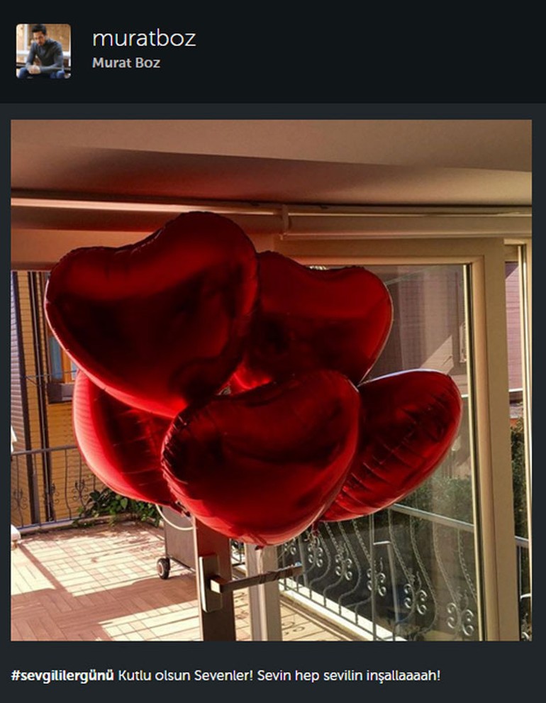 Dün ilk Sevgililer Günü'nü kutlayan çiftten Murat Boz, Aslı Enver'e yaptığı balonlu sürprizin fotoğrafını Instagram sayfasında paylaştı. Boz, fotoğrafın altına "Sevgililer Günü Kutlu olsun sevenler! Sevin hep sevilin inşallaaaah!" notunu düştü.