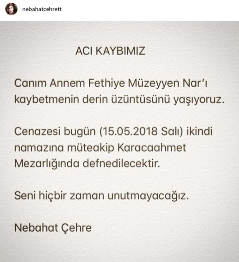 Oyuncu Nebahat Çehre'nin annesi Fethiye Müzeyyen Nar vefat etti.