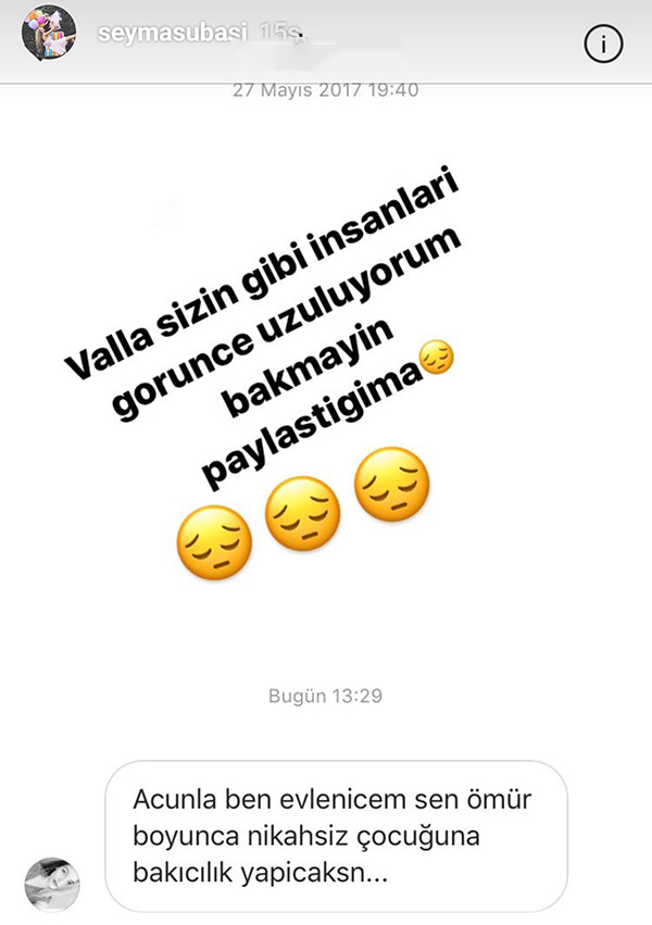 Sosyal medyada bir takipçisinin yolladığı “Acun'la ben evleneceğim, sen ömür boyunca nikahsız çocuğuna bakıcılık yapacaksın" mesajını ifşa etti.