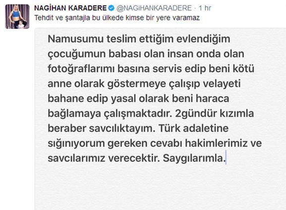 Nagihan Karadere bu haber sonrası Twitter hesabından 'Tehdit ve şantajla bu ülkede kimse bir yere varamaz' başlığıyla şu açıklamayı yaptı: "Namusumu teslim ettiğim evlelendiğim çocuğumun babası olan insan onda kalan fotoğraflarımı basına servis edip beni kötü anne olarak göstermeye çalışıp velayeti bahane edip yasal olarak beni haraca bağlamaya çalışmaktadır. 2 gündür kızımla beraber savcılıktayım. Türk adaletine sığınıyorum. Gereken cevabı hakimlerimiz ve savcılarımız verecektir. Saygılarımla."