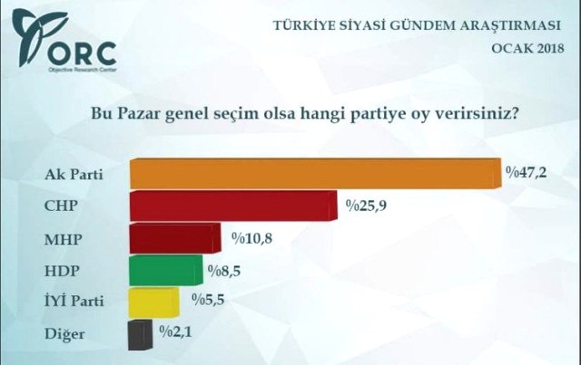 Türkiye 2019 seçimlerine doğru hızla yol alırken, 2018 yılının ilk anketi de yayımlandı. ORC 12-14 Ocak tarihleri arasında 34 ilde 2680 kişi ile yüz yüze görüşme yöntemiyle "Türkiye siyasi gündem araştırması" yaptı. Yapılan araştırmada bu pazar seçim olsa AK Parti ve MHP ittifakının yüzde 50'yi geçtiği görülüyor.