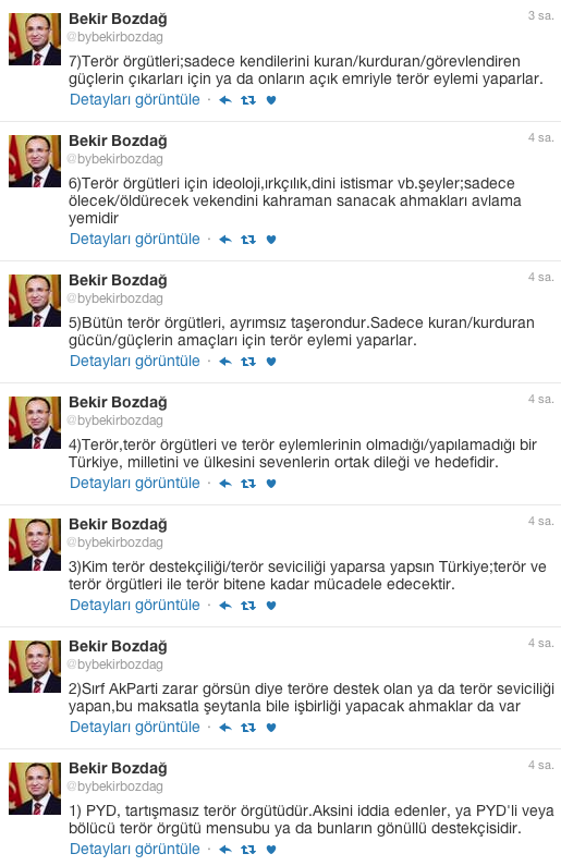 Bozdağ, Twitter hesabından yaptığı paylaşımda, PYD'nin tartışmasız bir terör örgütü olduğunu belirterek, "Aksini iddia edenler ya PYD'li veya bölücü terör örgütü mensubu ya da bunların gönüllü destekçisidir" ifadesini kullandı.