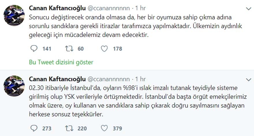 “02.30 itibariyle İstanbul'da, oyların %98'i ıslak imzalı tutanak teyidiyle sisteme girilmiş olup YSK verileriyle örtüşmektedir. İstanbul'da başta örgüt emekçilerimiz olmak üzere, oy kullanan ve sandıklara sahip çıkarak doğru sayılmasını sağlayan herkese sonsuz teşekkürler.