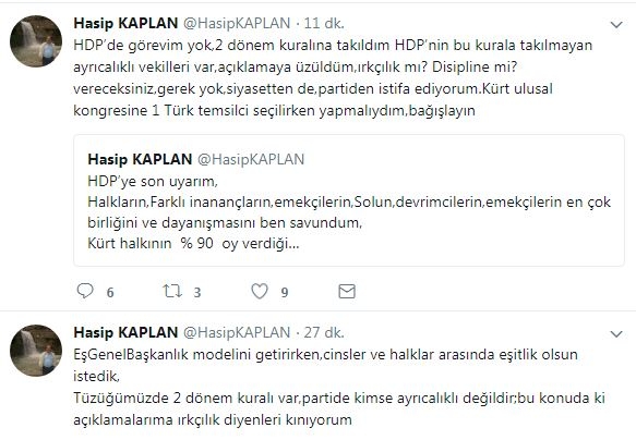 Eski HDP Şırnak Milletvekili Hasip Kaplan, "HDP kurultayında Demirtaş’ın yerine sakın bir Türk göz dikmesin, benim naçizane önerim,herkes haddini bilecek." dedi. Kaplan'ın açıklamasına HDP'den yanıt geldi. HDP'nin açıklamasında, "Hasip Kaplan Twitter hesabından yapılan ırkçı, ayrımcı ve ötekileştirici paylaşımların HDP anlayışı ve politikaları ile hiçbir ilgisi yoktur. Kınıyor ve ayıplıyoruz." dedi.