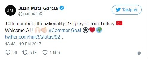 Juan Mata, Hasan Ali'nin mesajı sonrası, "10'uncu üyemiz. 6'ıncı farklı ülkemiz. Türkiye'den ilk oyuncu. Hoşgeldin Ali!" cevabını verdi.