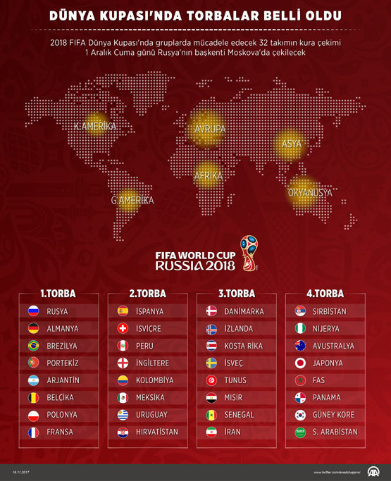 FIFA'nın internet sitesinden yapılan açıklamada, 1 Aralık Cuma günü Rusya'nın başkenti Moskova'daki Kremlin Sarayı'nda çekilecek grup kuraları öncesinde torbaların belirlendiği ifade edildi.