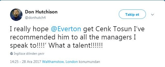 İngiltere Premier Ligi ekiplerinden Everton'da 1997-2000 senelerinde formayı terleten isimlerden biri olan Don Hutchinson'dan Cenk Tosun ile ilgili olarak övgü dolu br tweet geldi.