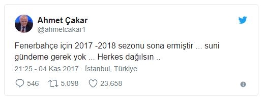 Twitter'dan paylaşımda bulunan Çakar, "Fenerbahçe için 2017 -2018 sezonu sona ermiştir... Suni gündeme gerek yok ... Herkes dağılsın..." yorumunu yaptı.