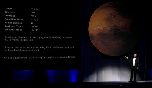Elon Musk, Mars'a yollanması planlanan uzay gemisinde 42 adet Raptor motoru kullanılacağını açıkladı. İlk yapılacak seferde eşyalarıyla birlikte 100 adet yolcu bulunmasının planlandığını söyleyen Musk, başlangıç olarak çok fazla insanın bu yolculuğa katılmaya hevesli olmayacağını belirterek, çok fazla istihdama ihtiyaç duyulacağını vurguladı. Mars’ta, sıkıştırılmış atmosfere sahip kapalı alanlarda tarım mahsulü yetiştirileceğini de anlatan Musk, uzay gemisi seferlerinin devam edebilmesi adına daha fazla kaynak çıkarılmasının önemli olduğunu söyledi.