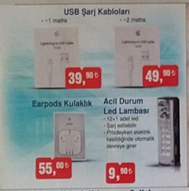 Satılacak olan şarj kablolarının 1 Metre uzunluğunda olanı 39,90 TL’ye, 2 Metre uzunluğunda olanı da 49,90 TL’ye satılacak. Apple Earpodskulaklığının satış fiyatı ise 55 TL olarak belirlenmiş.