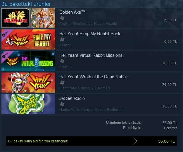 Şu an Jet Set Radio, Hell Yeah: Wrath of the Dead Rabbit ve Golden Axe adlı üç oyunu ücretsiz olarak satın alabilirsiniz.