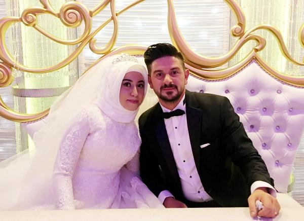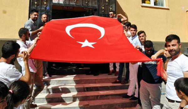 Damat Recep Erinkarlı'nın arkadaşları 'Erenler ölmez' sloganlarıyla Türk Bayrağı altında gelini çıkardı.